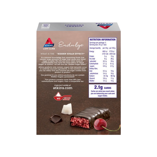 Ingredients: Dark chocolate 33% (cocoa mass, maltitol, cocoa butter, milk fat, emulsifier [soy lecithin], vanilla, low-fat cocoa), coconut 29%, polydextrose, maltitol syrup, maltitol, glycerol, soy flour, milk protein, thickener (acacia gum), emulsifier (soy lecithin), gelatine, flavours, acidity regulator (citric acid), cherry 0,1%, salt, sweetener (sucralose), colouring agent (carmine).