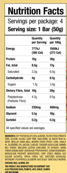 Made with the natural flavour of blueberries and almonds, these soft‑baked bars offer a wholesome, satisfying taste without the sugar spike. With only 2g of sugar, 4g of net carbs, and a generous amount of dietary fibre, they’re perfect for anyone looking for a low‑sugar, low‑carb, high‑protein option that supports balanced blood glucose levels.